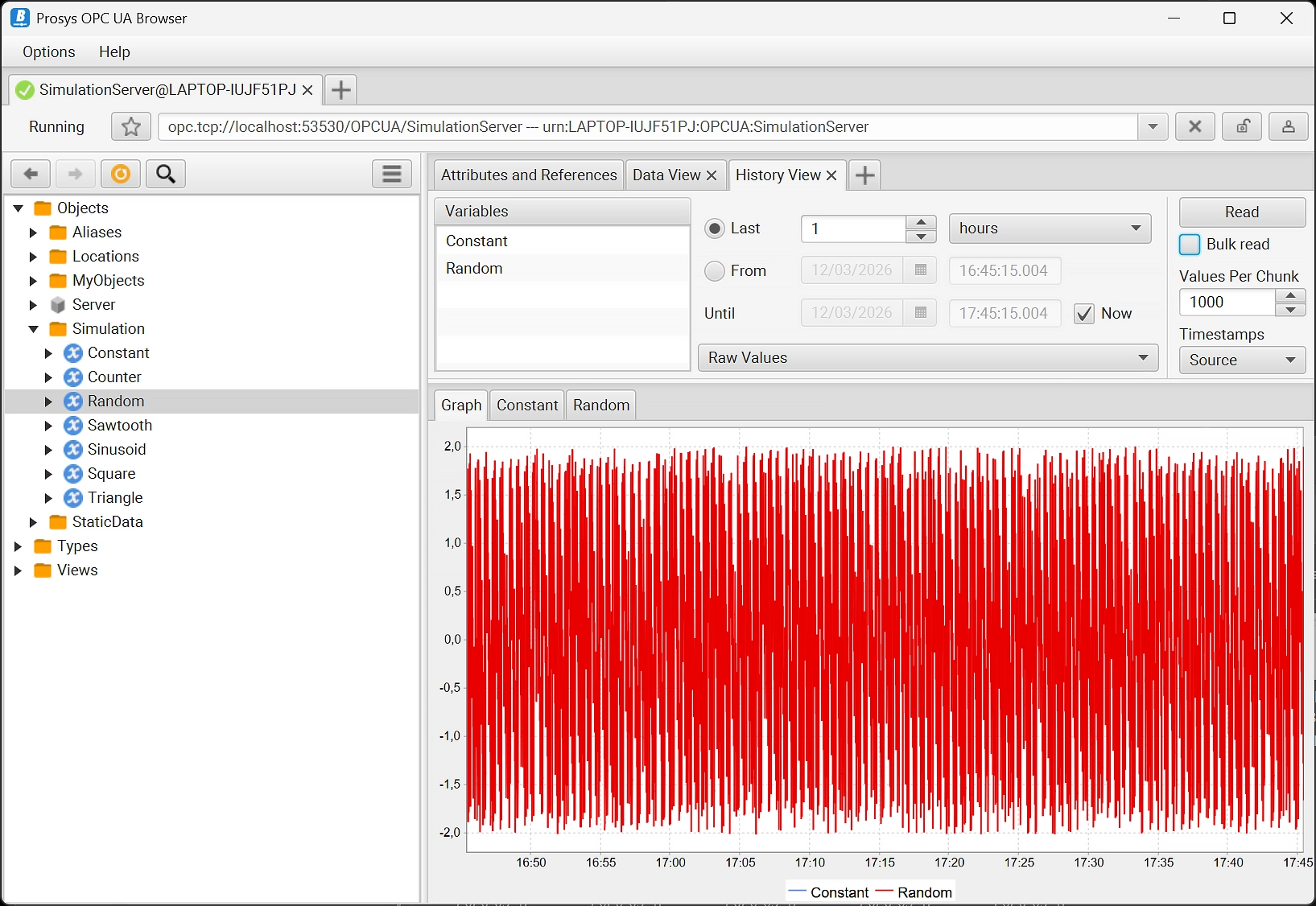 You can access the current data of any OPC UA server via the Server Address Space View. The Attributes and References View shows the basic information of all OPC UA nodes. You can read and write variable values, but also monitor them for data changes using the Data View. You can also visualize data changes with a trend graph and record data changes in a file using the Data Logger functionality.