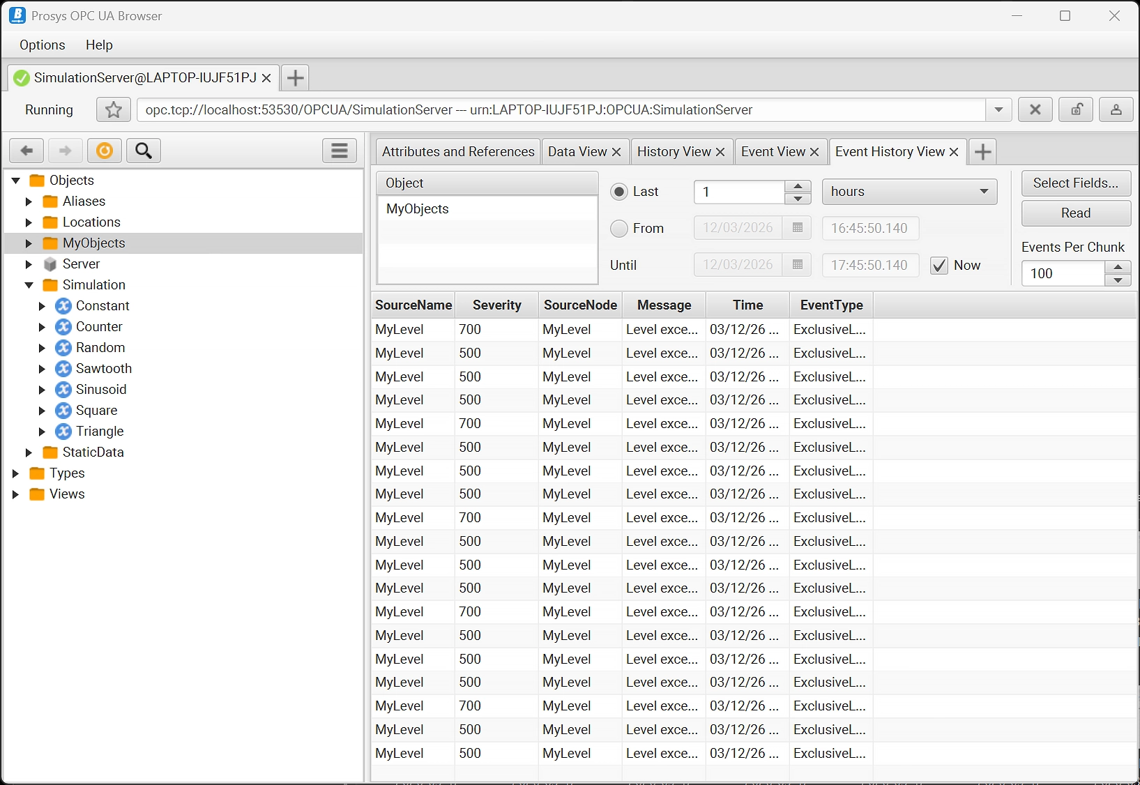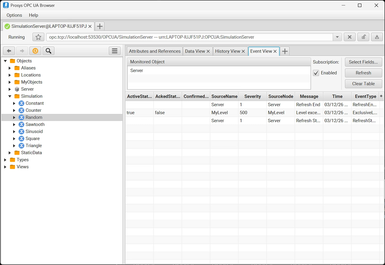 The Event View enables you to monitor server events, including alarms and conditions. You can choose which fields to monitor and you can also acknowledge and confirm alarms. The Event History View enables you to also read event histories from the server.