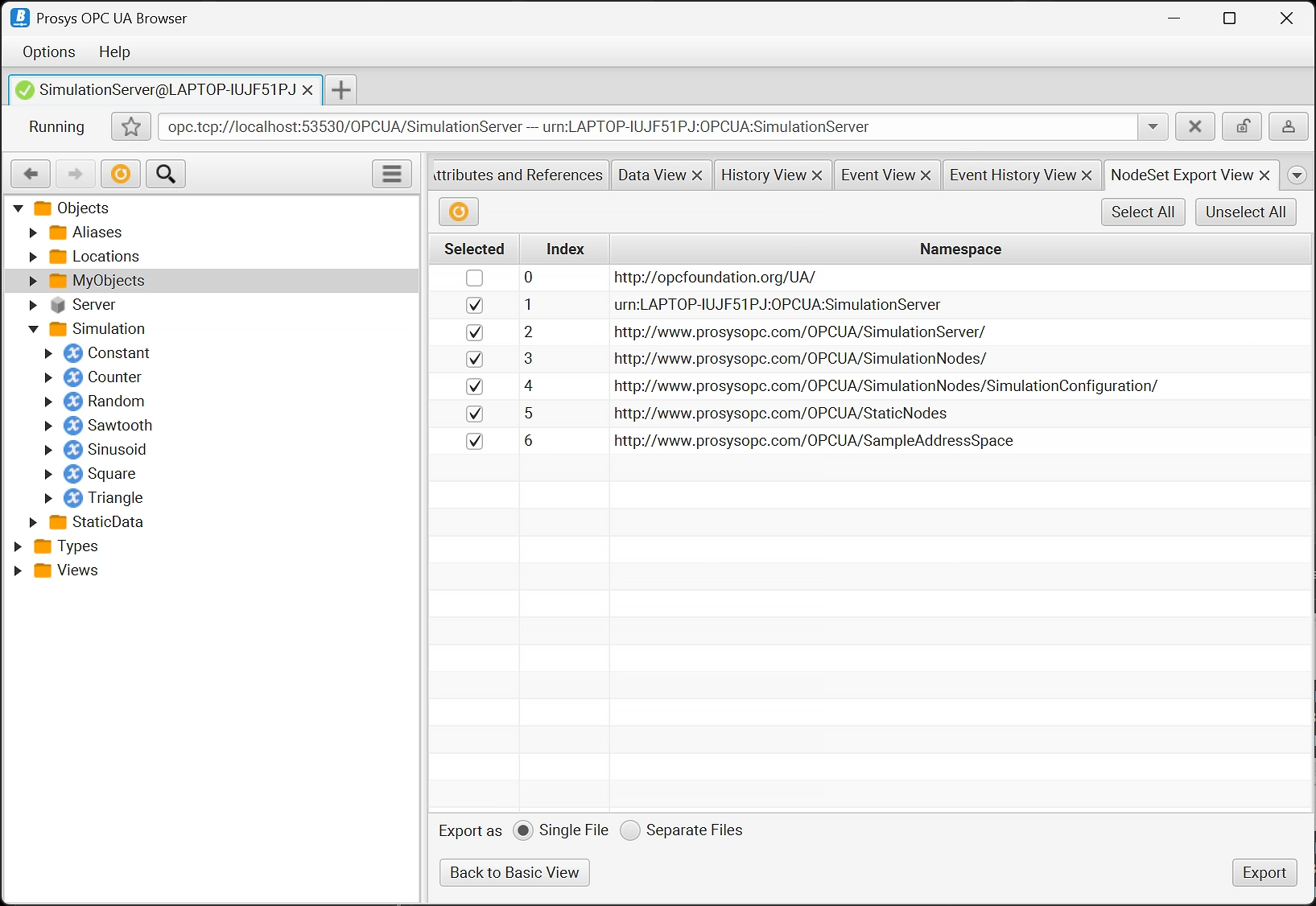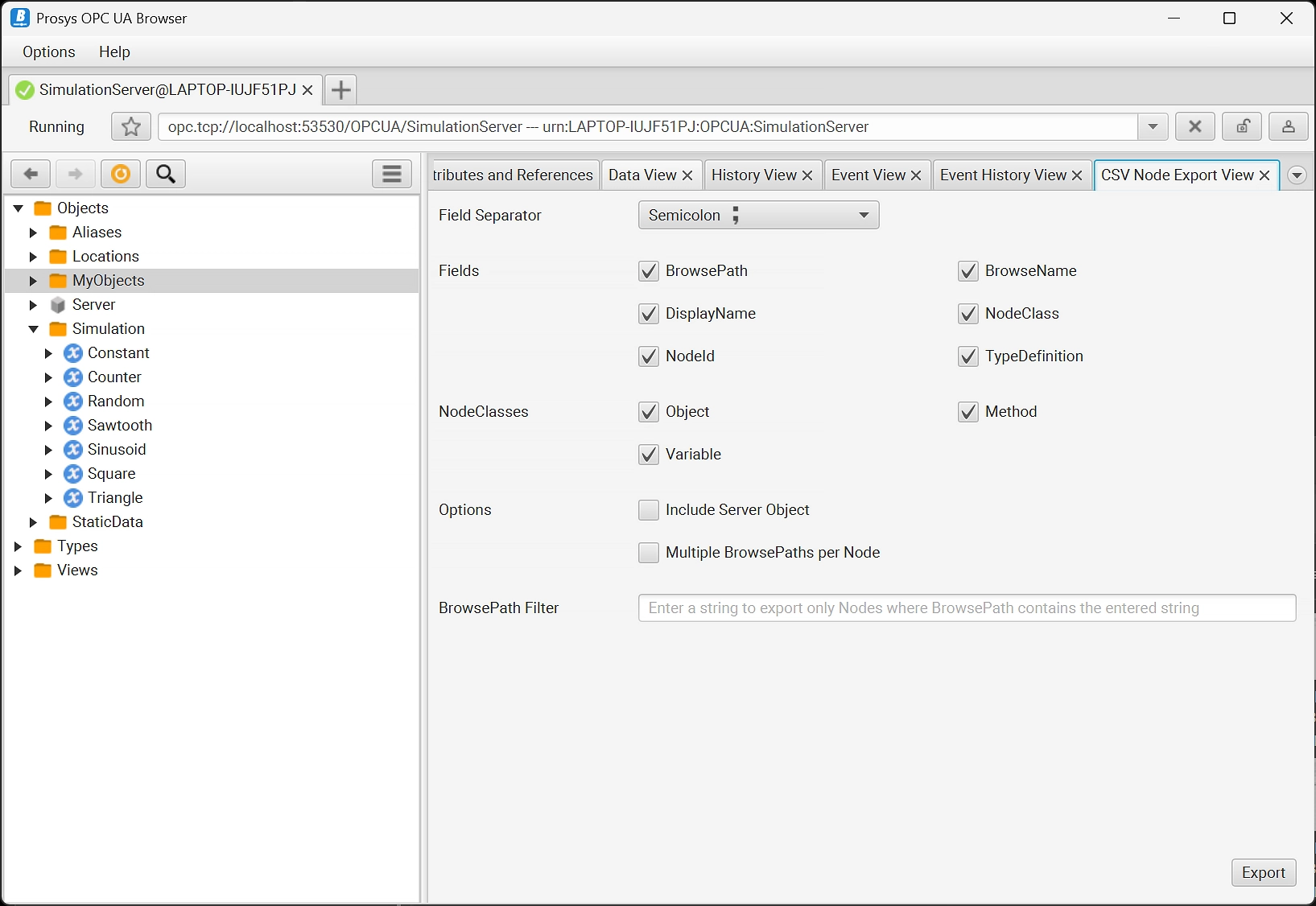 Export the NodeSet and use CSV logger to enable Simulation Server playback feature to mirror structure and data from real production environments. Test, simulate and demonstrate on a new level of reality. More information »